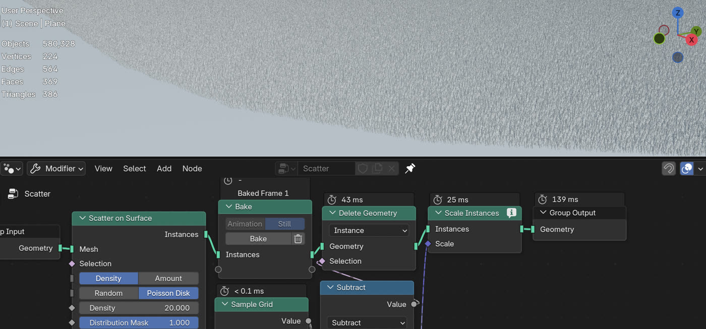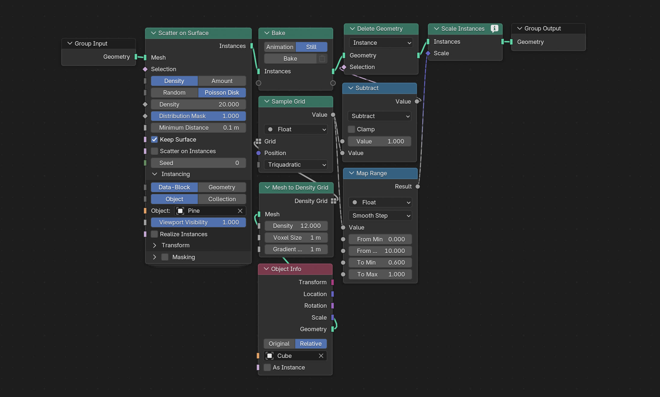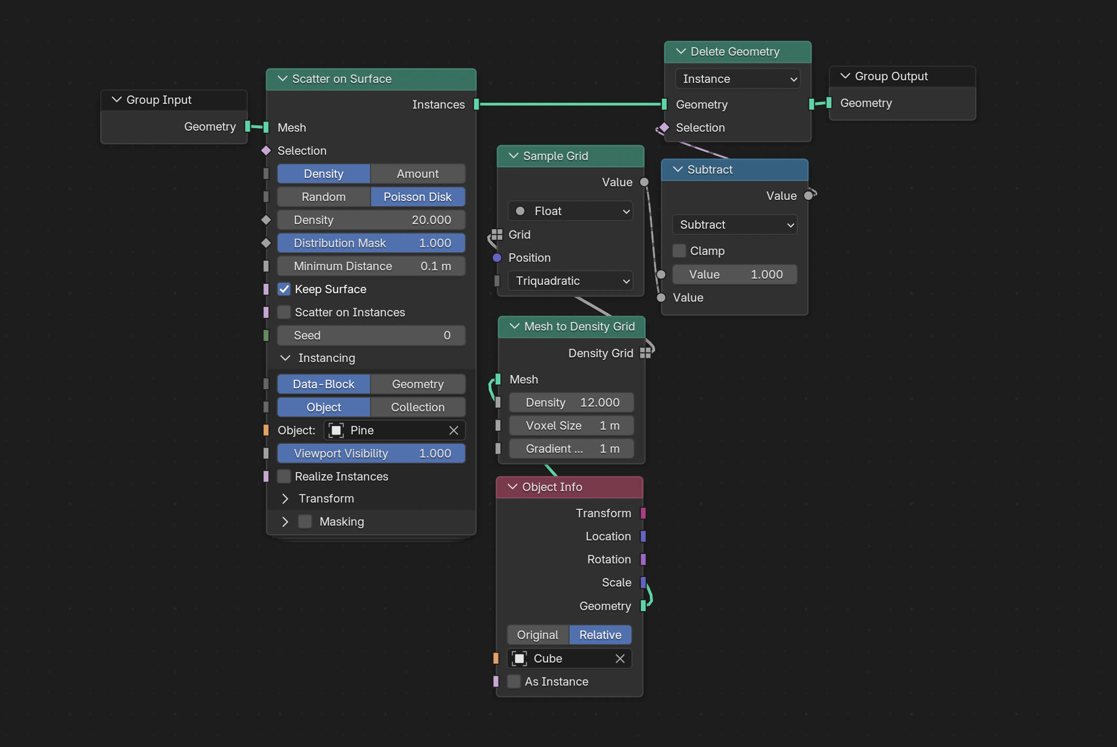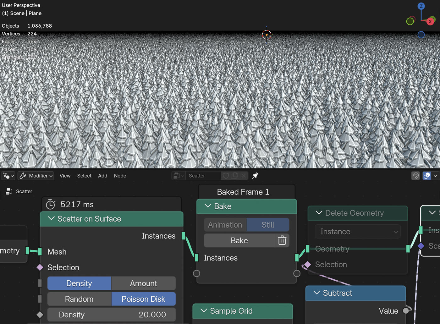 So instead of doing that, we just scatter instances on the entire surface and then delete instances outside of the volume with the Delete Geometry node in Instance mode. This way, we check the culler density per distributed instance rather than per geometry vertex. This will work on any geometry, even if it consists of just two triangles. The downside of scattering on the entire surface and then deleting is of course that it’s slower, especially if you’re using the Poisson Disk distribution. But this is where baking comes in!